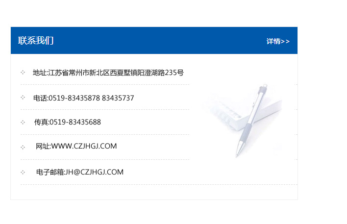 地址:常州市新北區(qū)友邦商務(wù)大廈1幢16、17層  電話:0519-85101652  傳真:0519-85112595  郵編:213022  網(wǎng)址:www_cz-jiayue_cn.hgspjx.com  郵箱:xiajifengaa@163.com